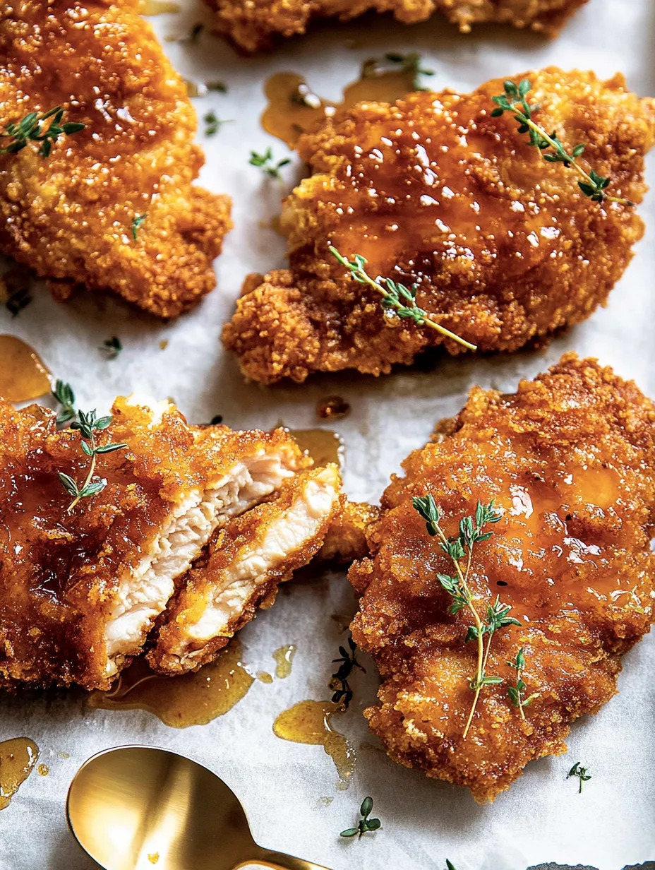 Questo pollo si riscalda benissimo, rendendolo perfetto per preparare i pasti in anticipo. Conserva il pollo raffreddato in un contenitore ermetico in frigorifero fino a 3 giorni. Tieni la salsa al miele separata nel suo contenitore. Quando vuoi gustarlo, riscalda il pollo su una griglia in forno a 190°C per 10 minuti fino a renderlo di nuovo croccante, poi versa sopra la salsa leggermente riscaldata. La separazione impedisce alla panatura di diventare molliccia.
