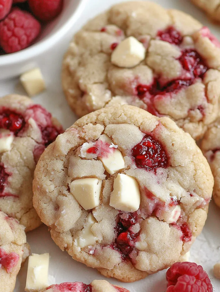 Le lamponi incontrano il cioccolato bianco in questi biscotti irresistibilmente morbidi dalla consistenza perfetta. L'unione del dolce e cremoso cioccolato bianco con le note fruttate e leggermente acidule dei lamponi crea un'esperienza di gusto che mette in ombra i classici biscotti al cioccolato. L'impasto delicato con bordi croccanti racchiude una deliziosa sorpresa sotto forma di gustosa confettura di lamponi all'interno.